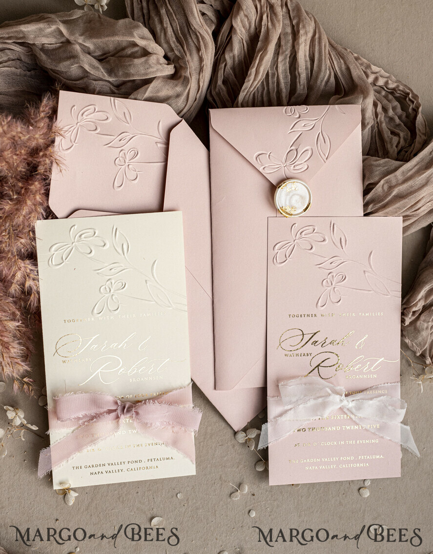 Bespoke Embossed Blind Blus Pink Gold Wedding Invitation, Golden Nude deboss Floral Wedding Invitation, Modern Garden Debossed Invitation suite, Cotton paper wedding invitation suite, Wedding Invitations golden ( 05/emBL/z )
